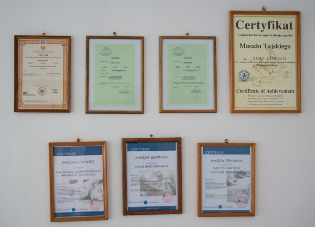 - ukończenie 2-letniej szkoły medycznej z uzyskanym tytułem i dyplomem technika masażysty, który daje kwalifikacje do wykonywania masaży klasycznych, terapeutycznych i relaksacyjnych m.in. w placówkach medycznych